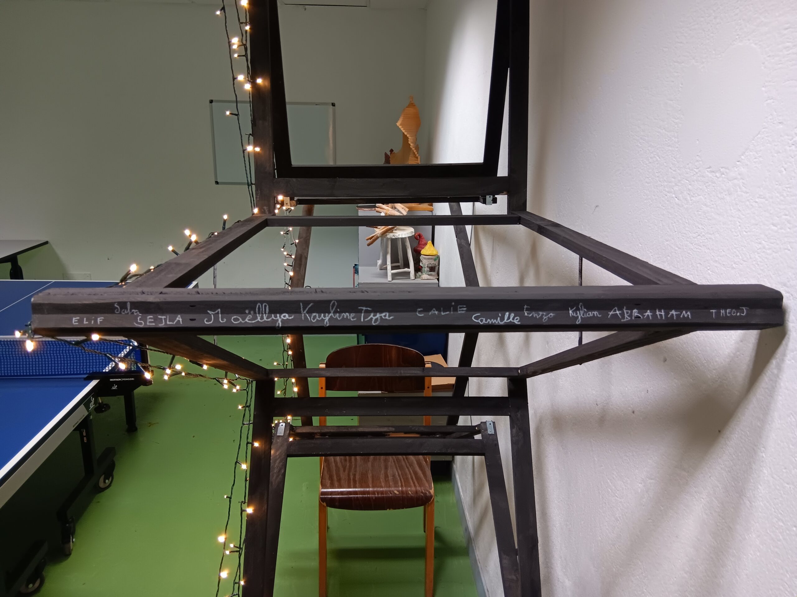 Une fois le matériel réuni, nous avons procédé à la peinture des tréteaux, avant de passer à l’assemblage de l’étoile. Cette phase technique s’est faite à l’aide d’équerres en métal et de vis à bois. Les jeunes ont dû coopérer et s’entraider afin de mener à bien l’assemblage.