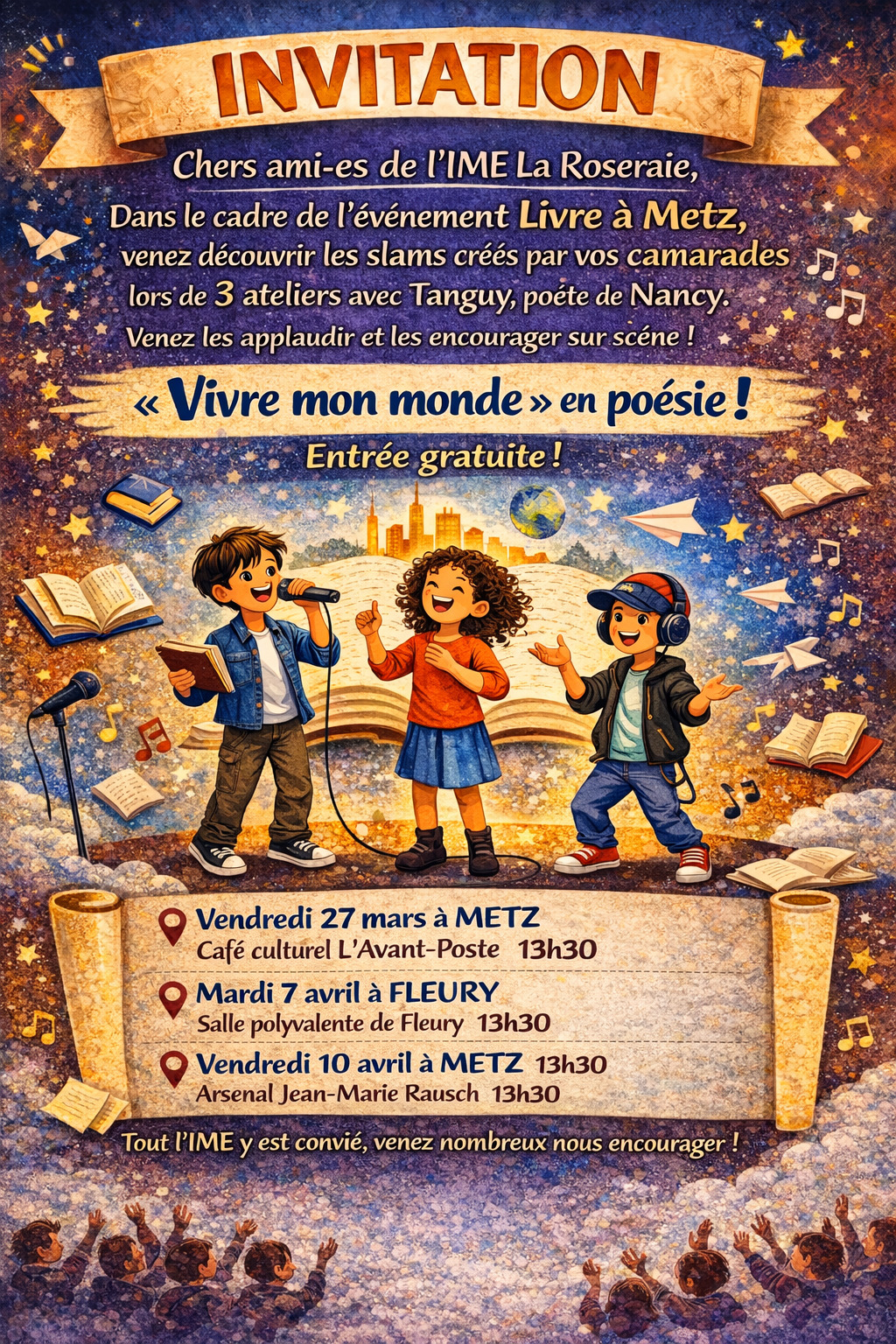 Dans le cadre du « Festival du Livre à Metz » accompagnés du slameur Tanguy R. Bitariho, 7 jeunes de l’IMPro — Tya, Kayline, Calie, Léna, Edmir, Elif et Kylian — se sont lancés dans une aventure artistique unique : écrire et porter leur propre slam autour du thème « Habiter le monde ». À travers leurs mots, chacun livre un morceau de vie, avec sincérité, force et émotion. Après une première représentation au Café culturel de La Poste de Metz, venez découvrir et applaudir ces jeunes poètes et poétesses lors de deux nouvelles dates :